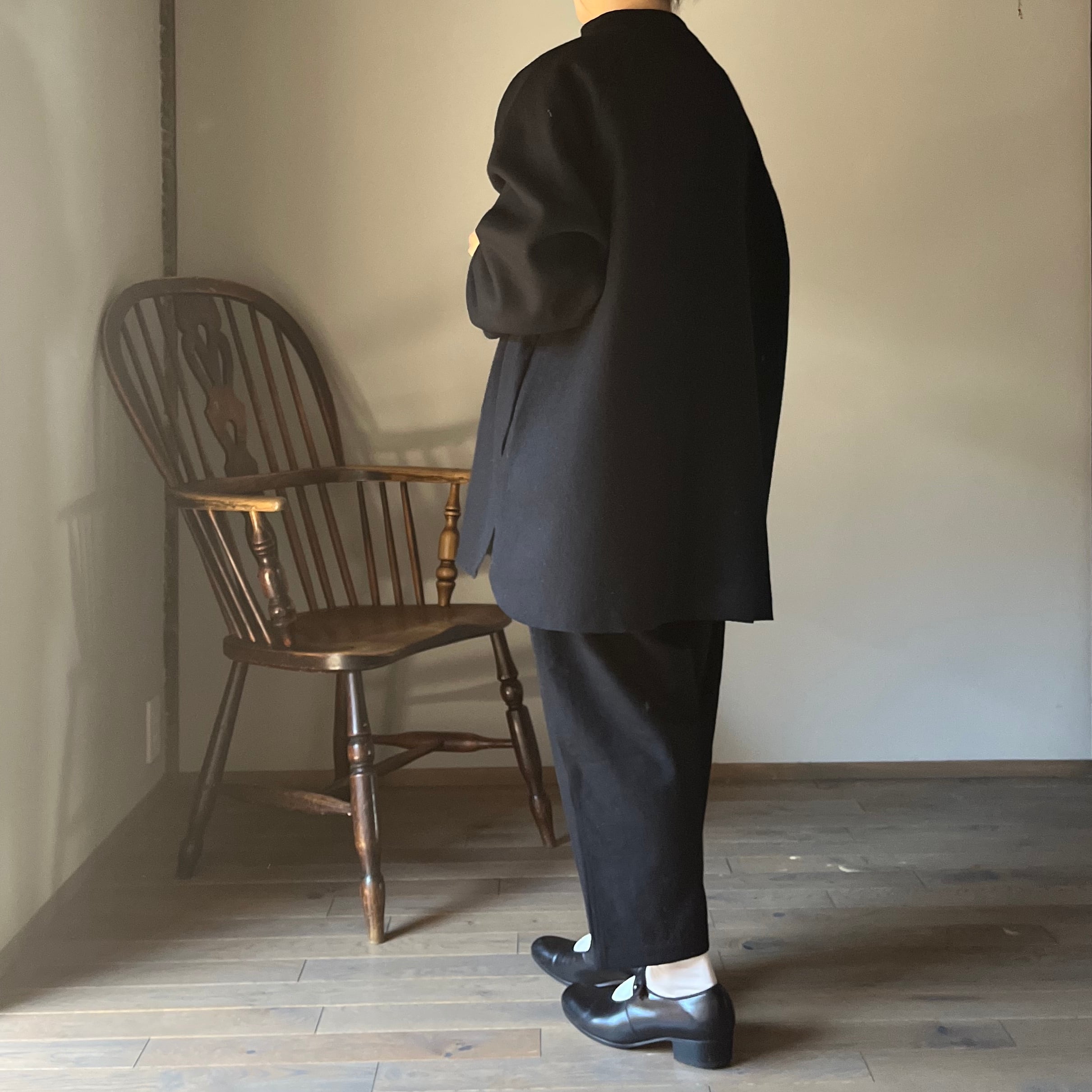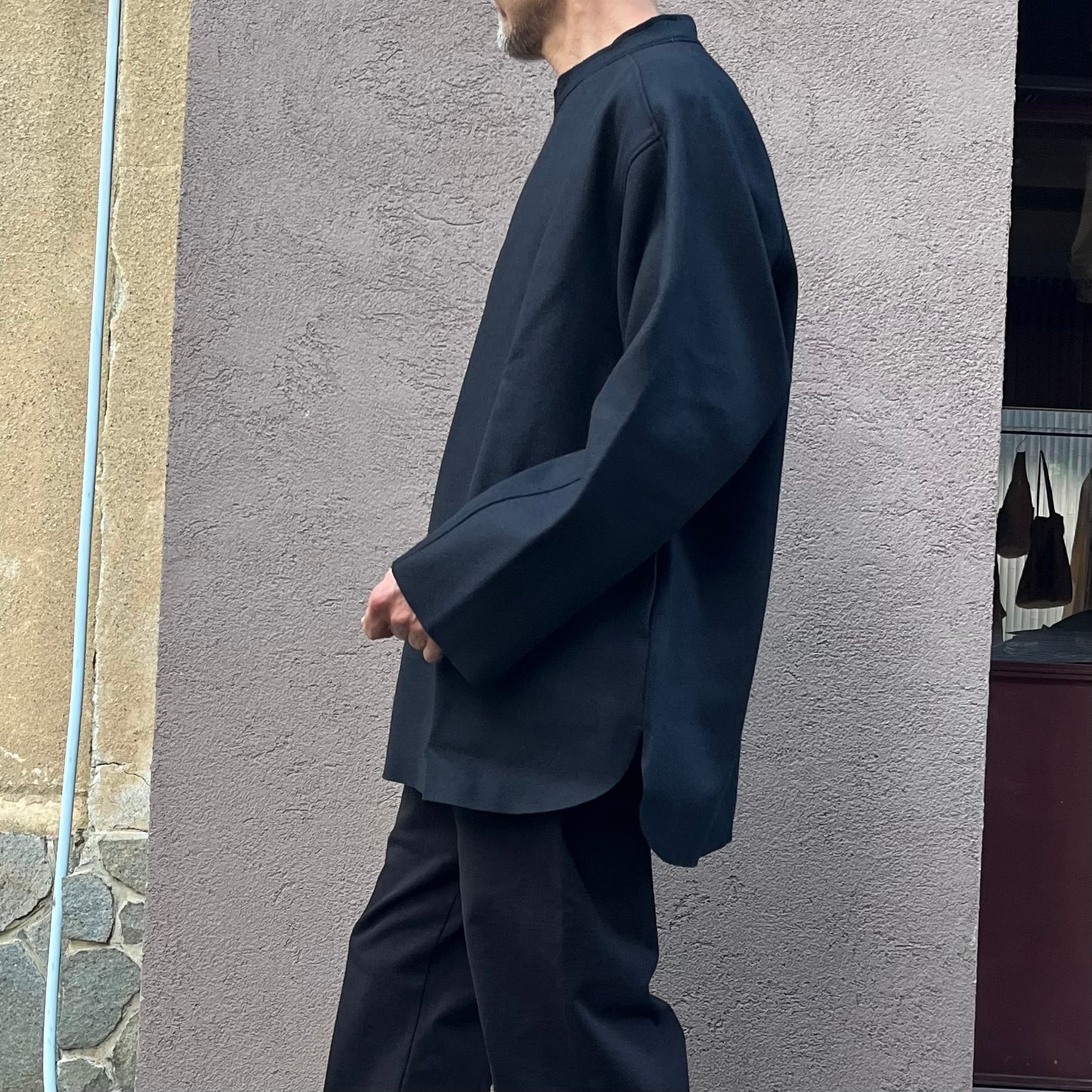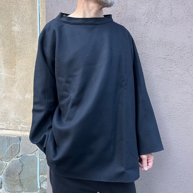 オーバーサイズのプルオーバーで、身体と生地の間に空間を多く取り、セーターやジャケットとは異なる解放感があります。スプリットラグランスリーブにより、程よい運動量が確保され、綺麗に立つ衿元が特徴です。プルオーバーのデザインながら、縫い目を利用したポケットが付いており、実用性も兼ね備えています。