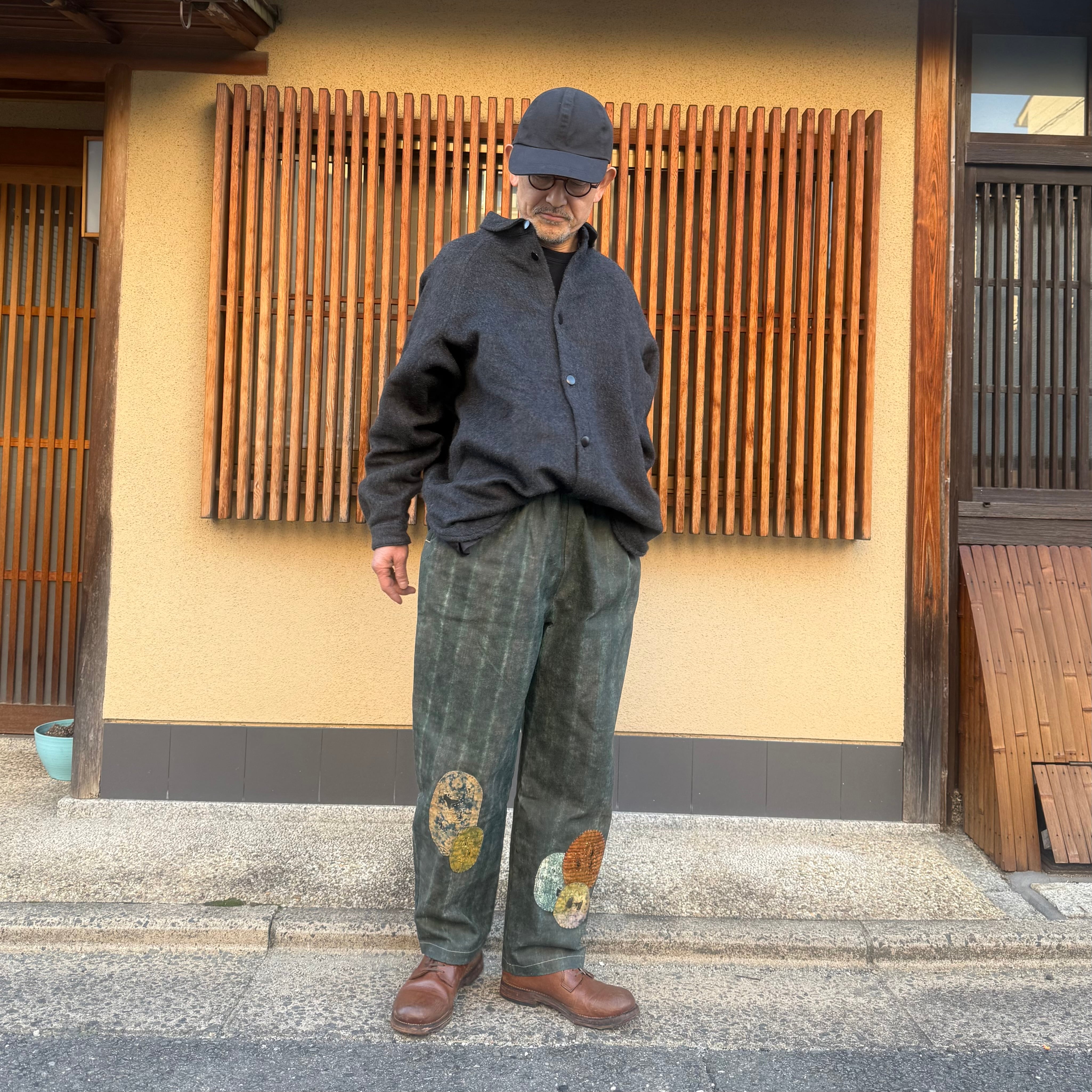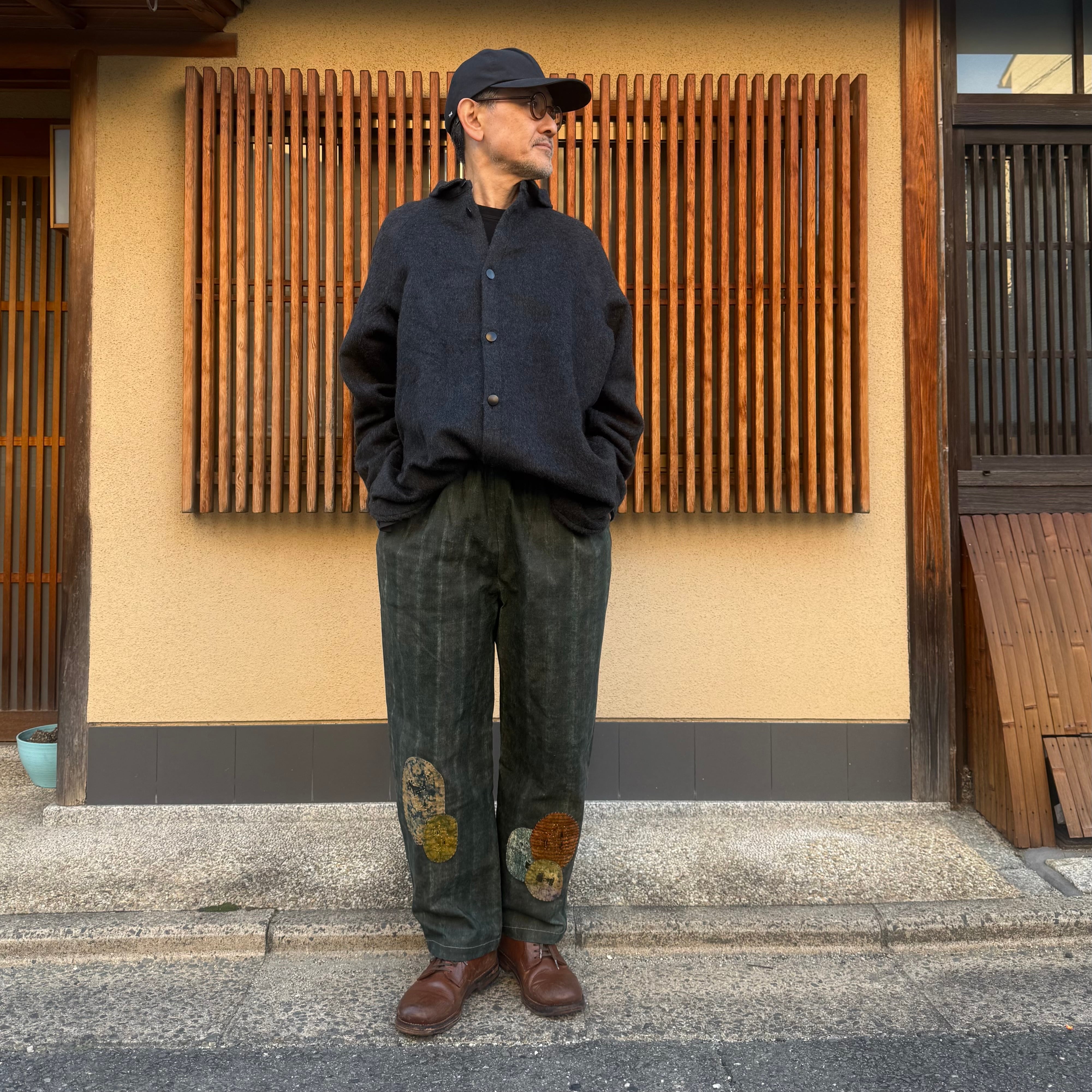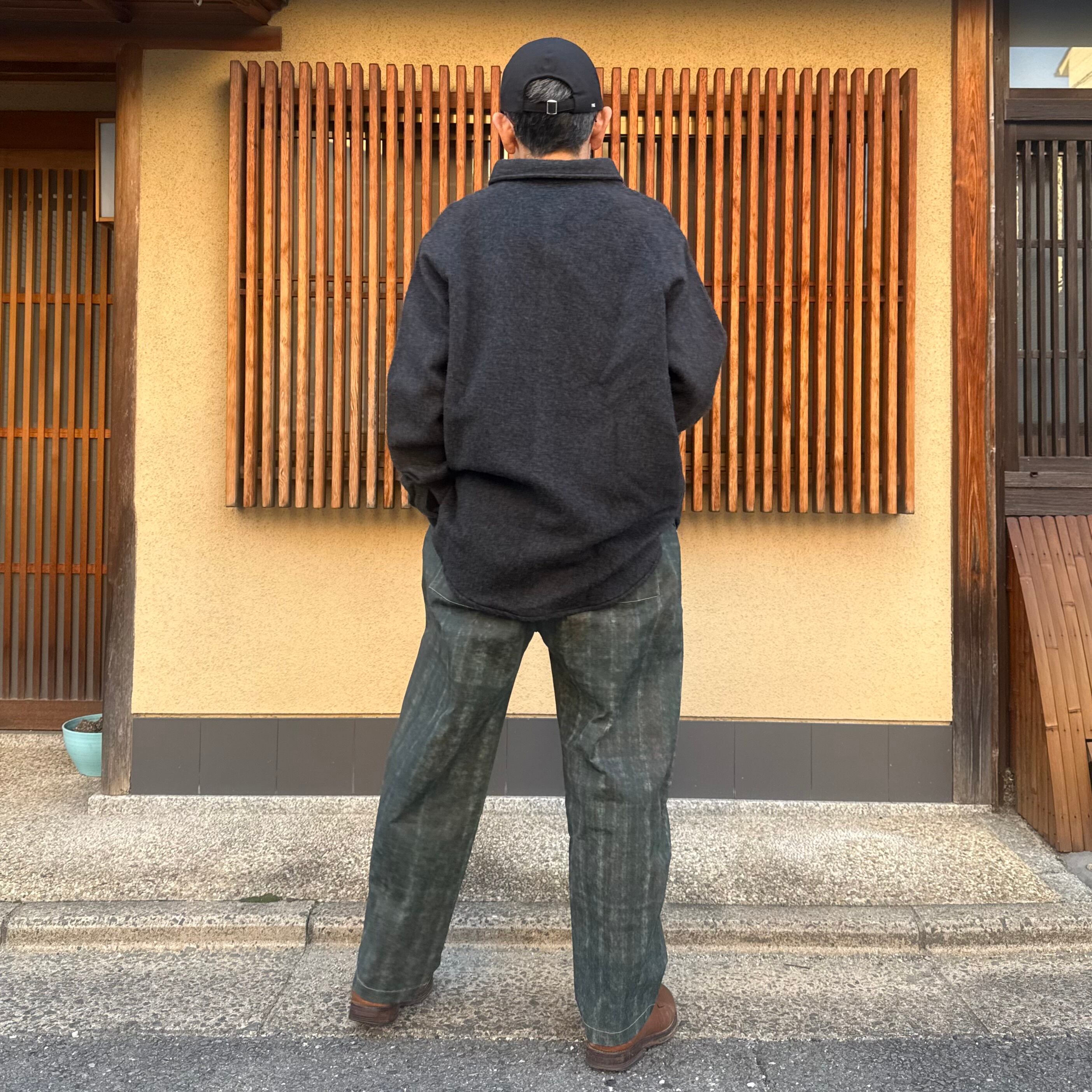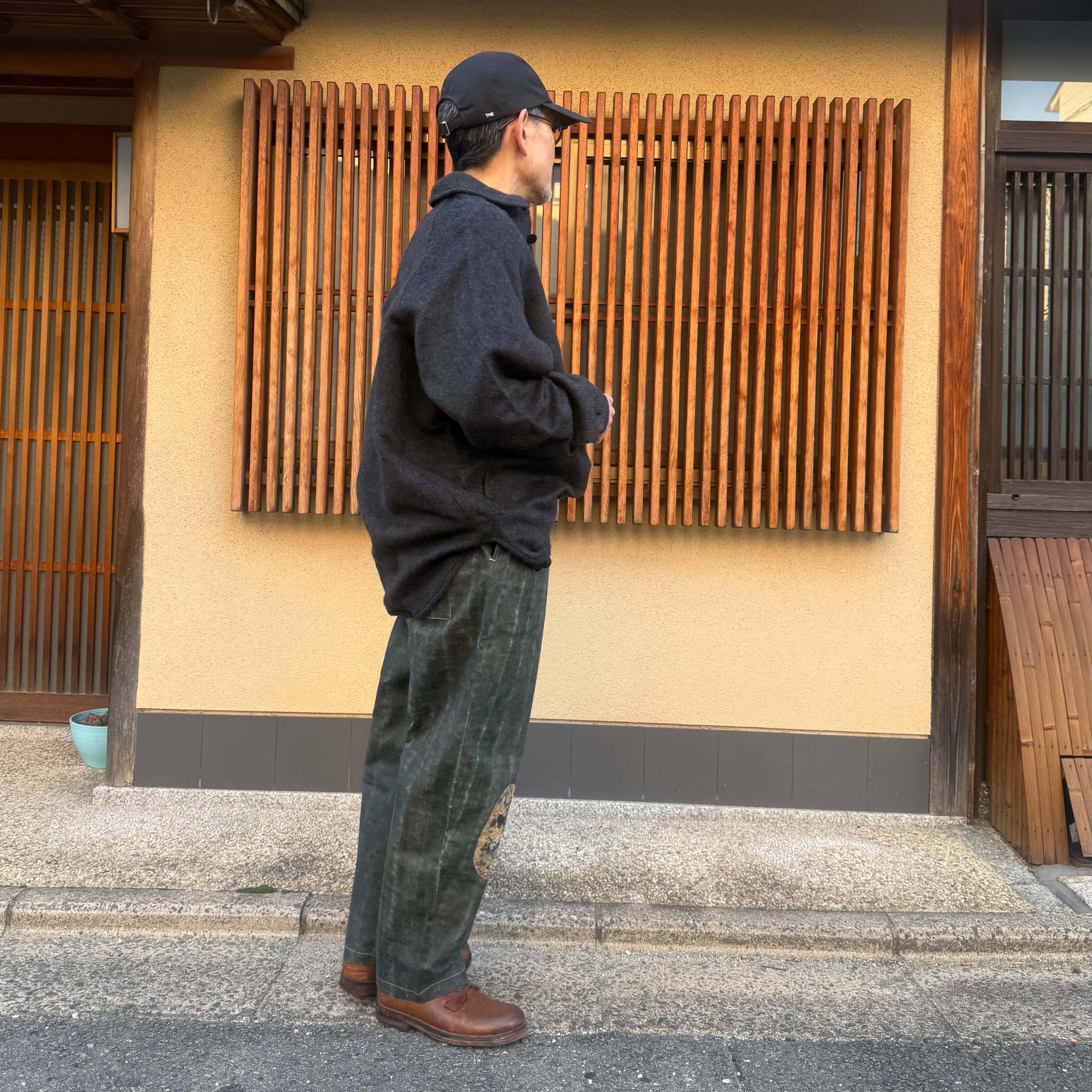 大きなマチを袖下から脇にかけて配置することで、平面から立体への変化を意識したデザインです。こちらのマチによって、運動量を確保しながらも自然なゆとりが生まれています。また、厚手の生地との組み合わせにより、アウターとしての機能性も十分にあります。水牛の角のボタンを使用しています。