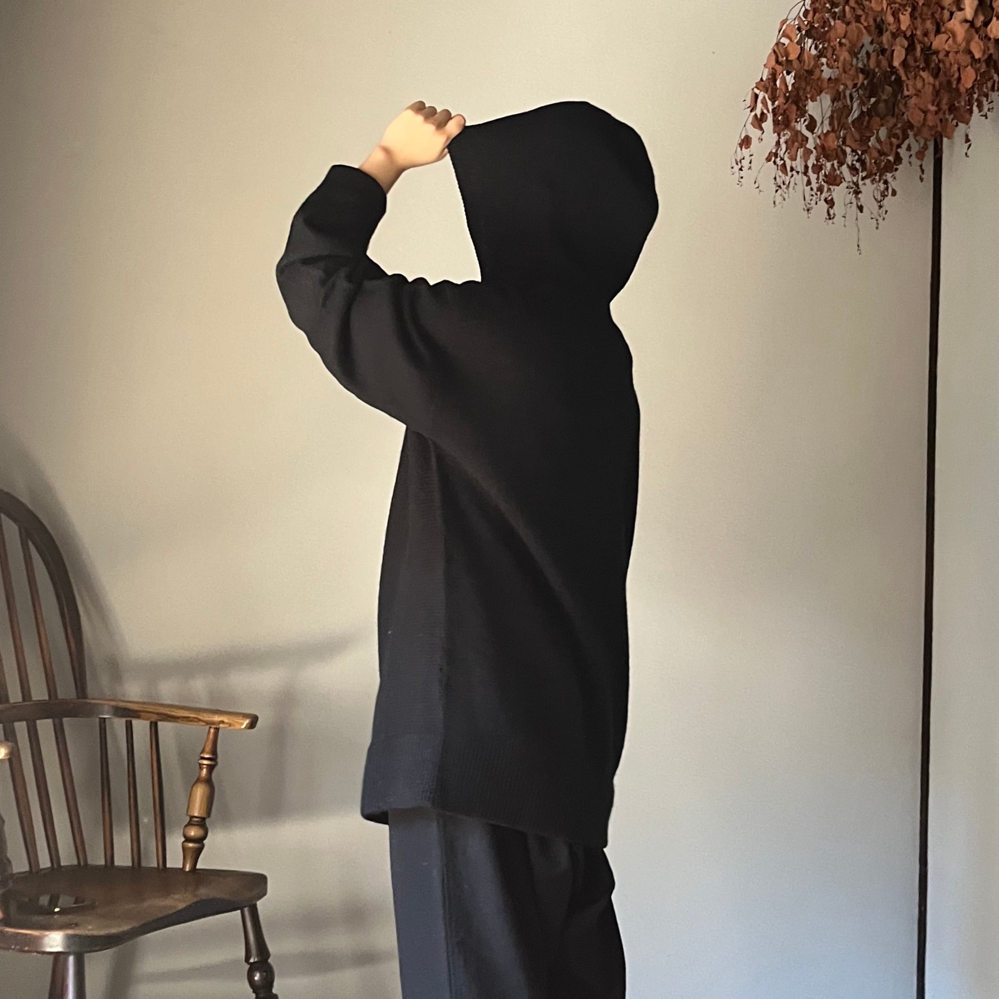 北方民族のフード付き防寒着を参照したデザインです。前襟ぐりを高くして保温性を高めており、フードを脱いだ時にも保温性が保たれるように工夫されています。これまでのニットの中で最も身幅が広く、中にしっかり着込むことができます。