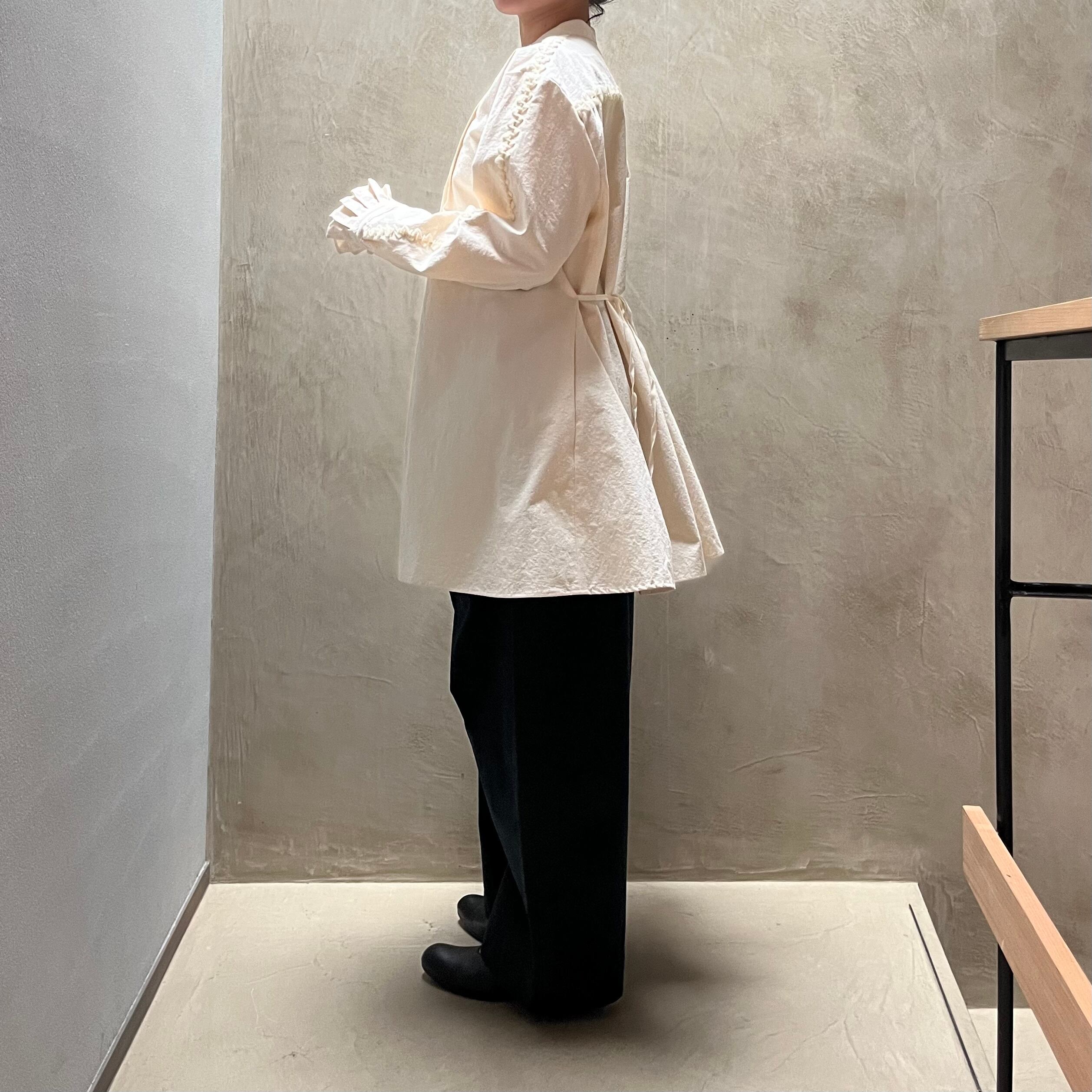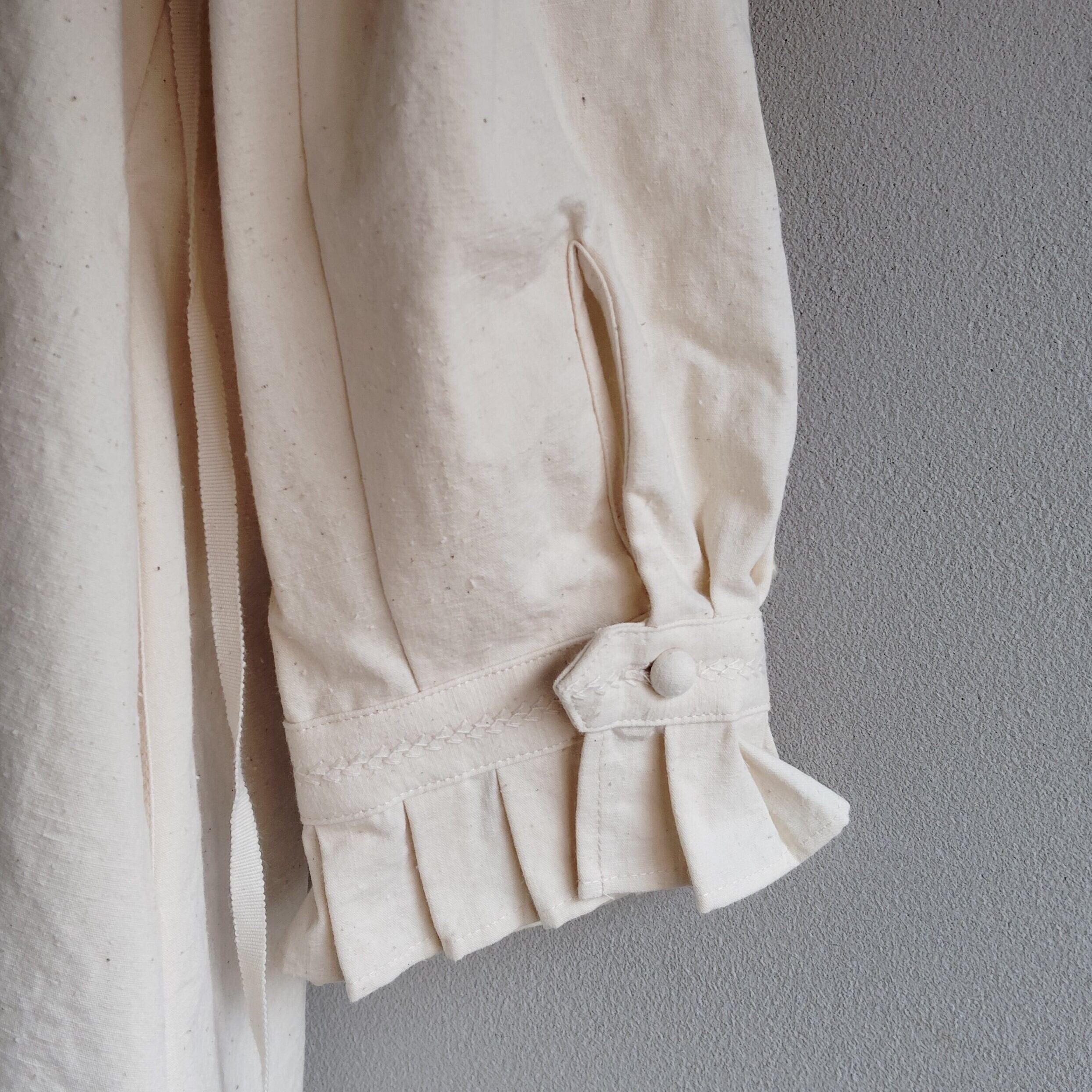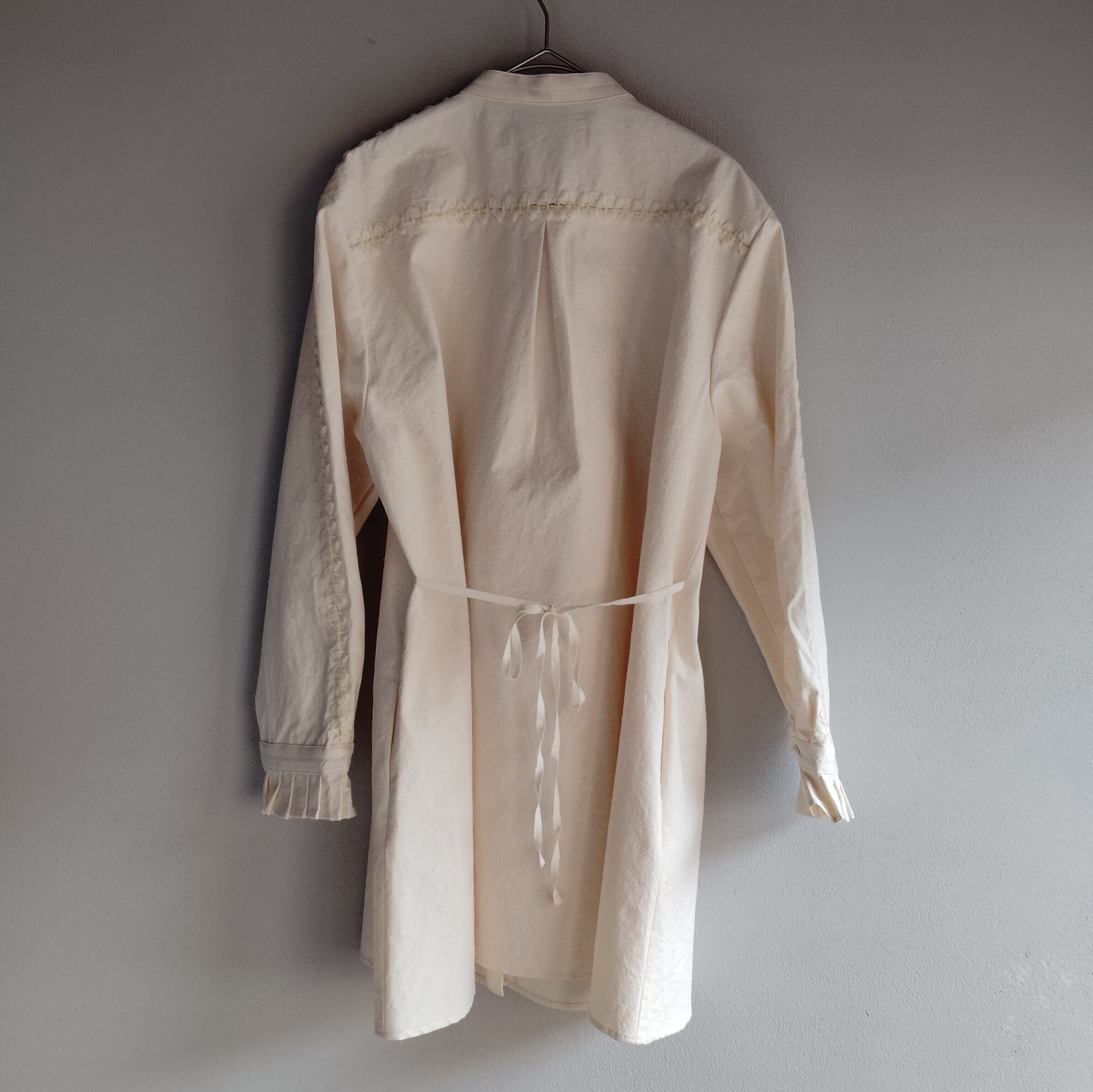 フォーマルな場面に着るドレスシャツと、作業着的なスモックの両方の要素をまぜたようなデザインになっています。