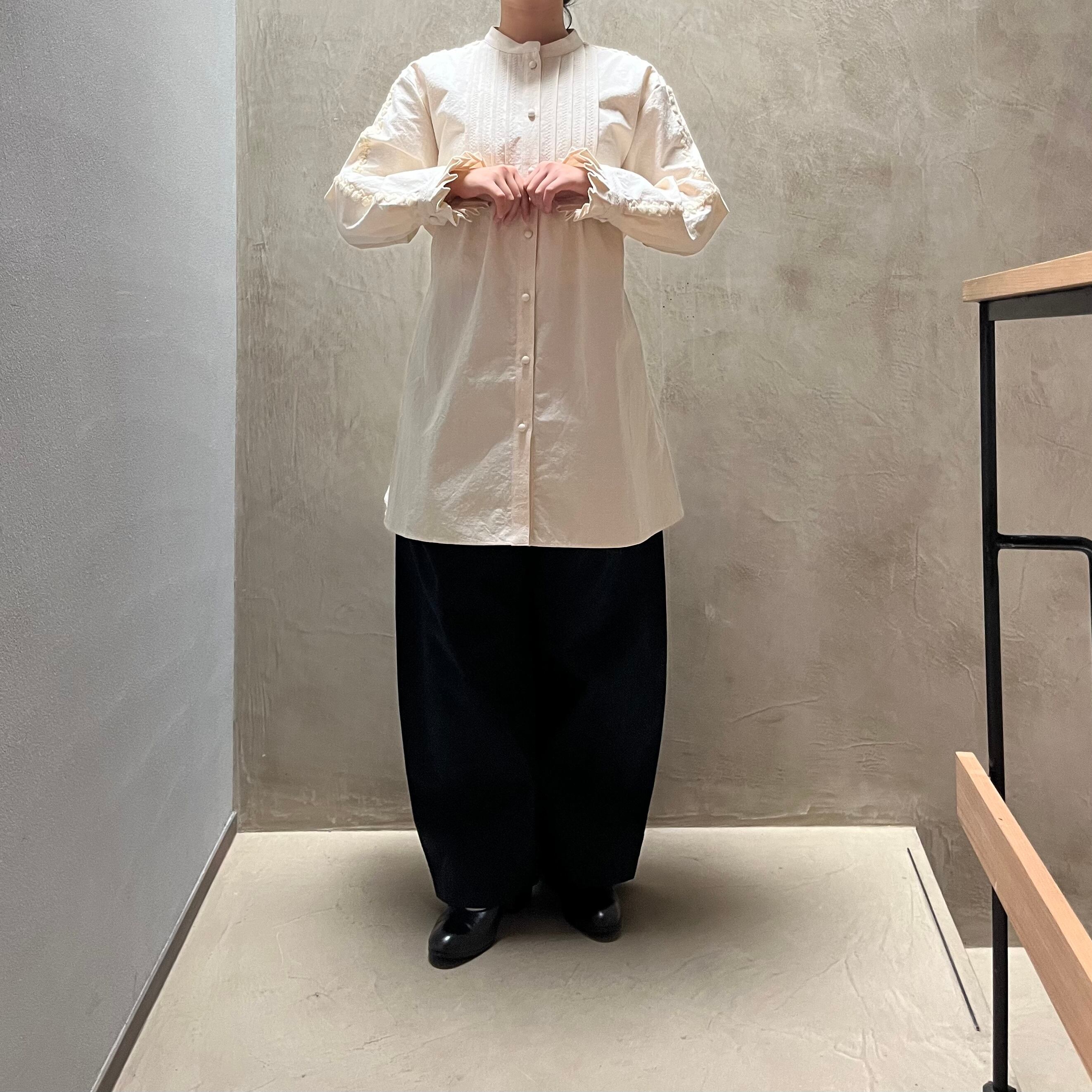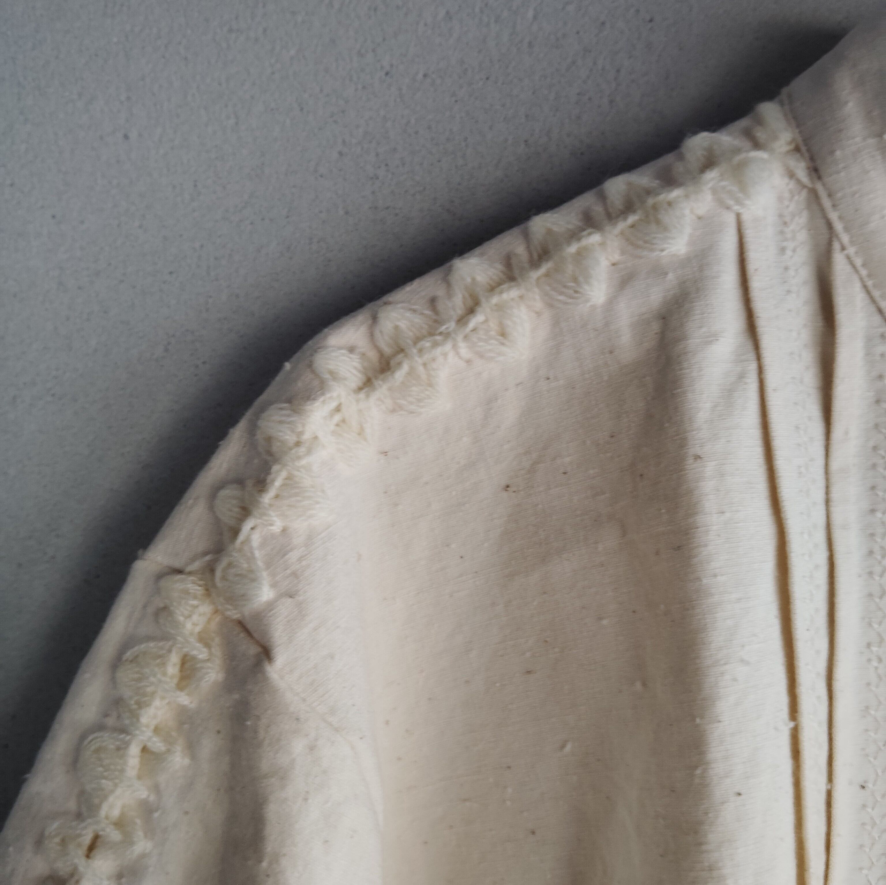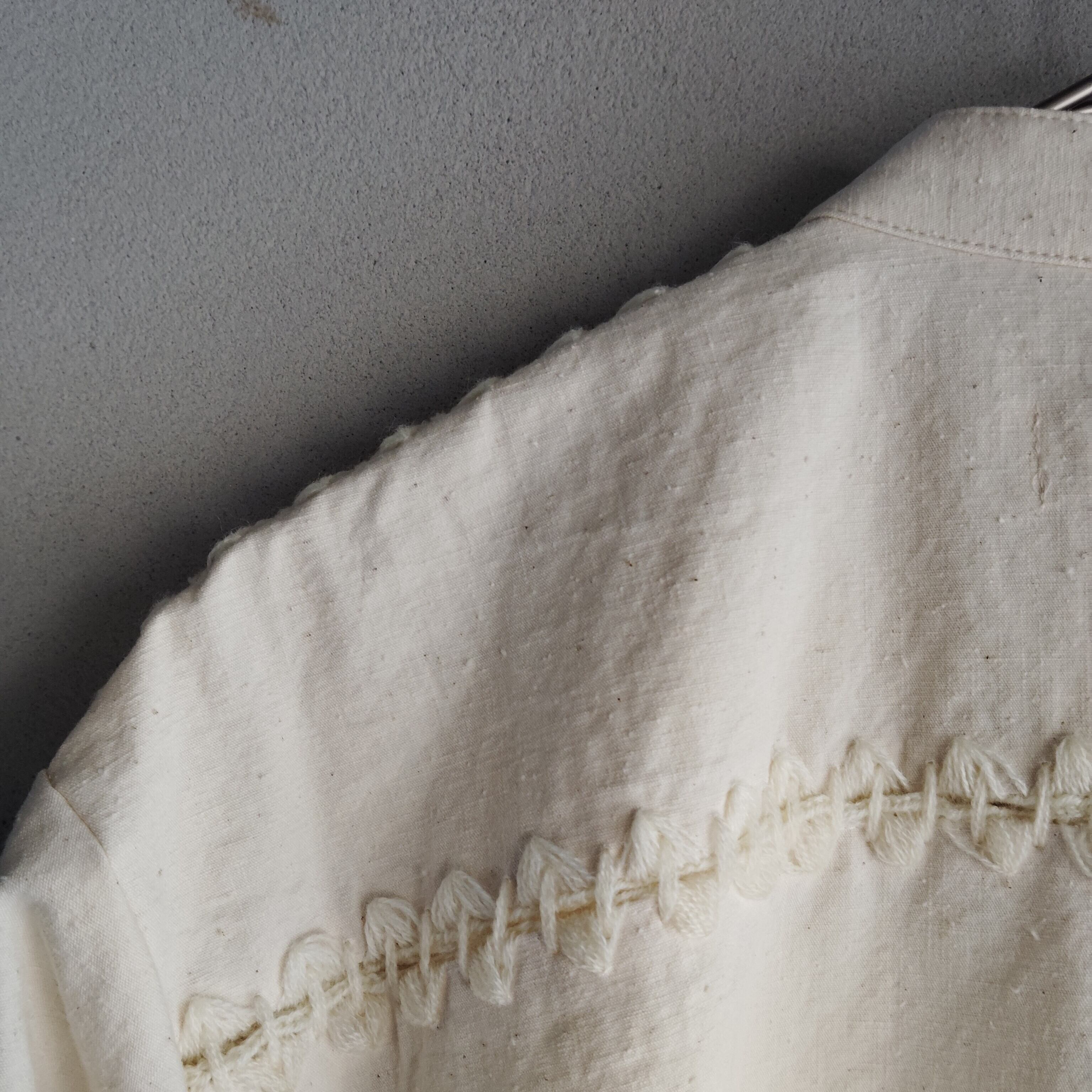 フォーマルな場面に着るドレスシャツと、作業着的なスモックの両方の要素をまぜたようなデザインになっています。