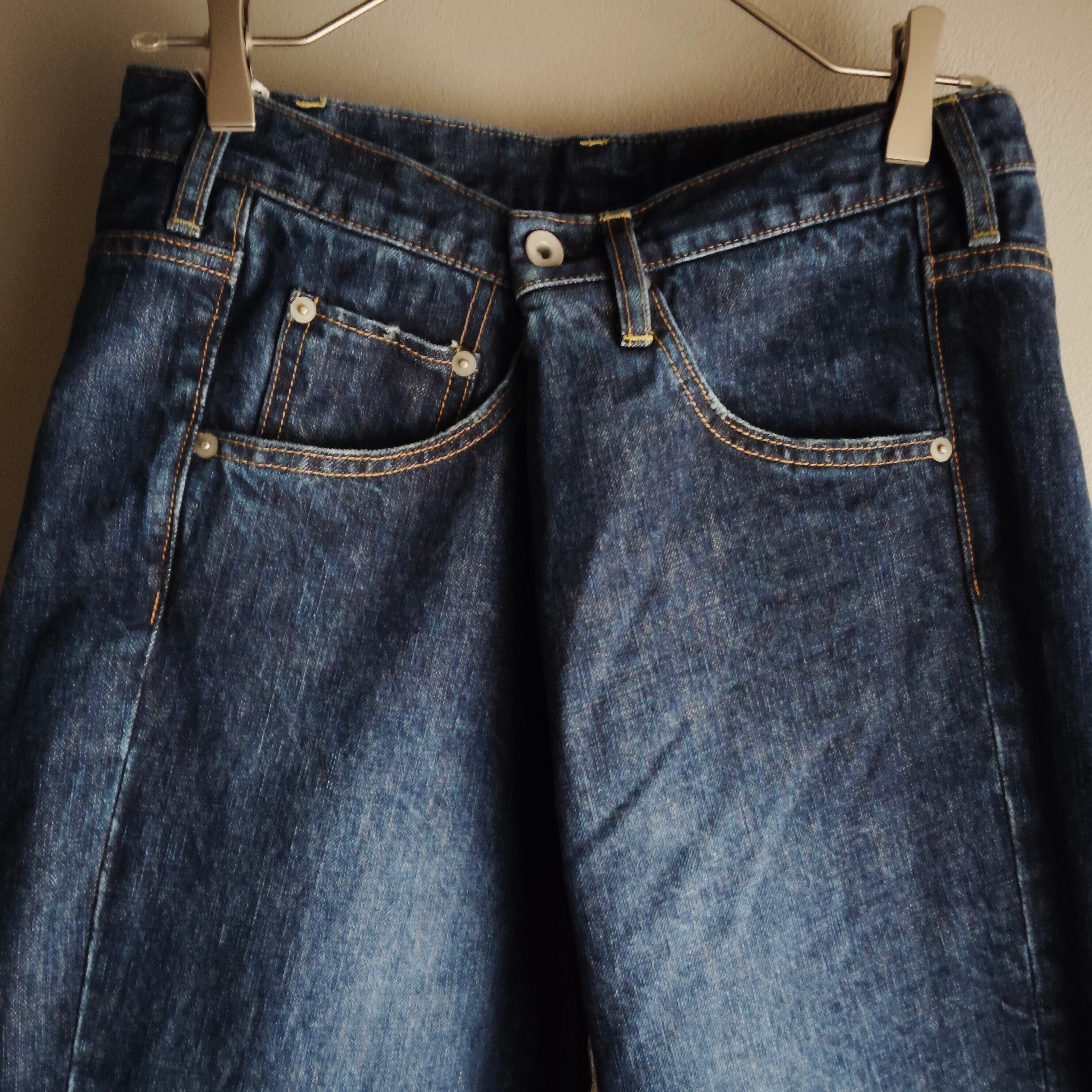 フロントのボタンをセンターからずらした位置に追加して、ラップパンツのようにウエストを絞って履くデニムパンツです。