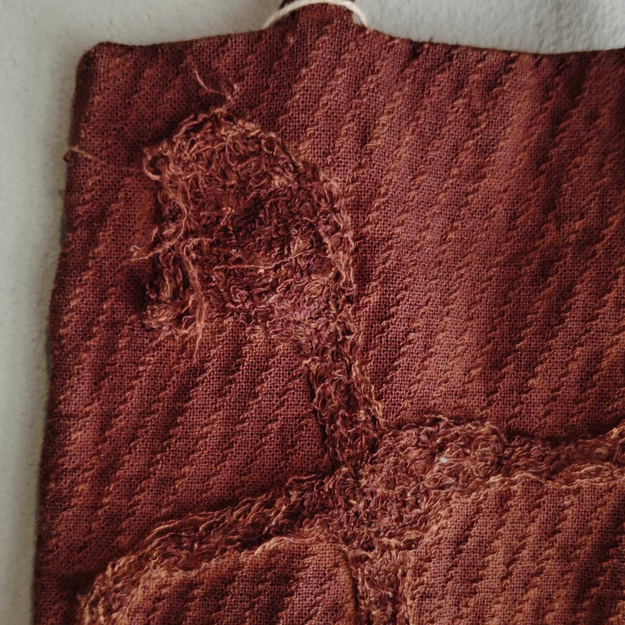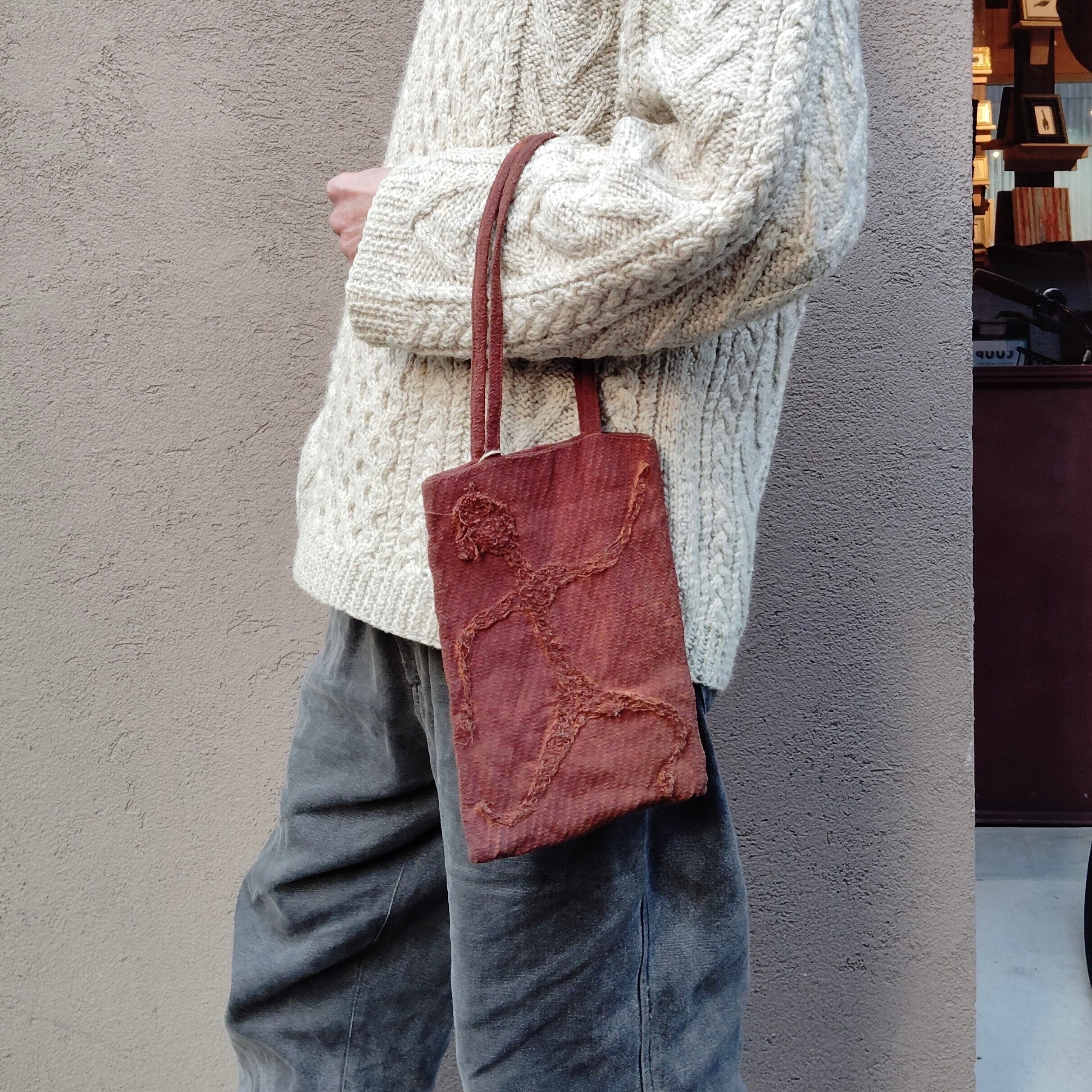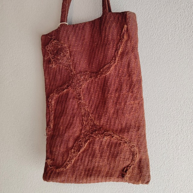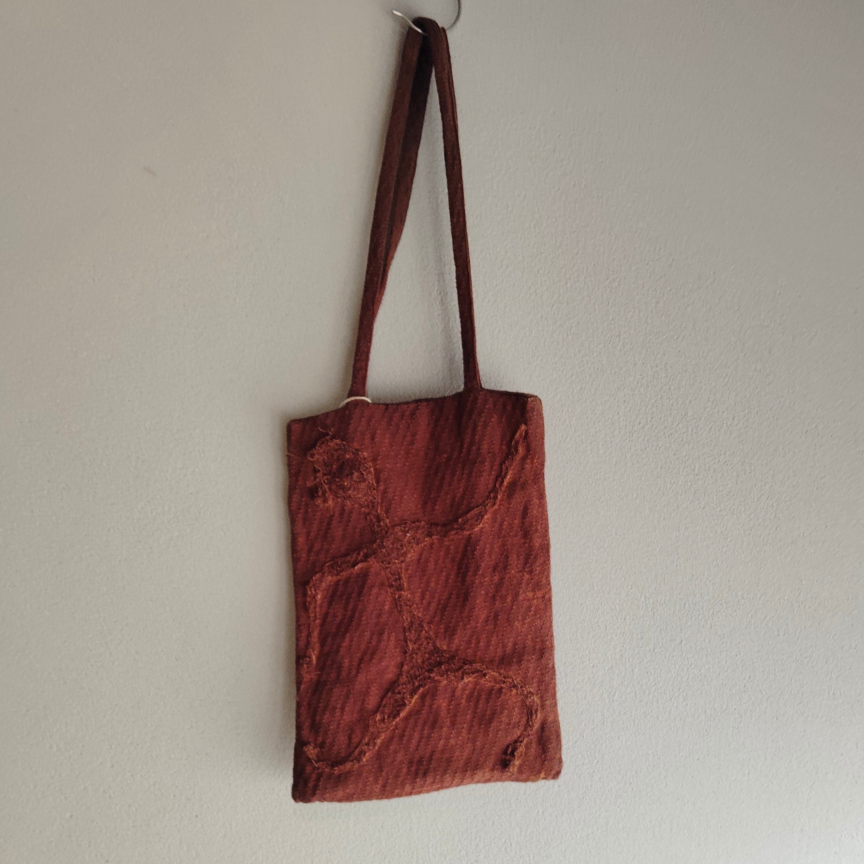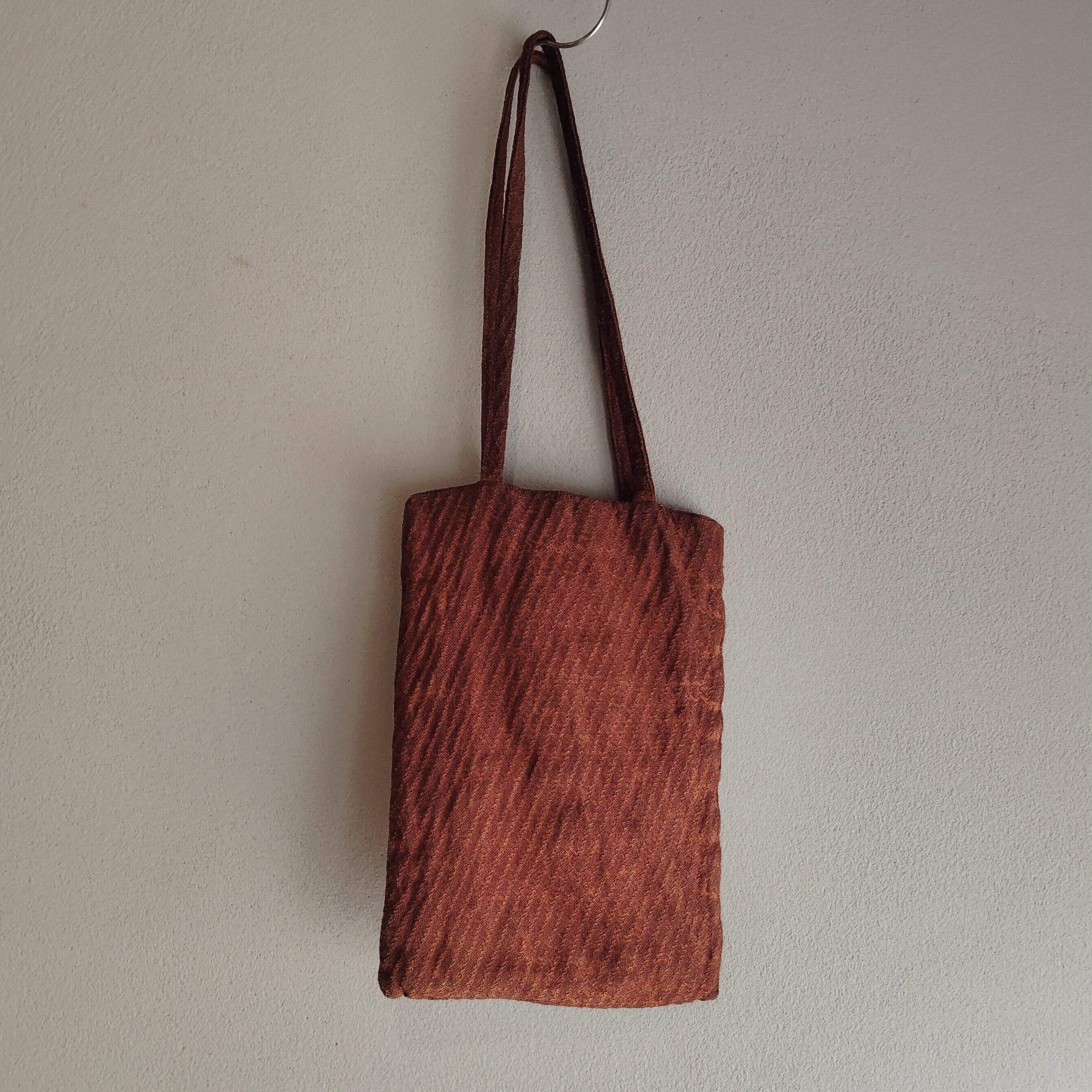 オーガニックコットン100%の生地にベンガラで赤茶に染めた小ぶりなバッグ。