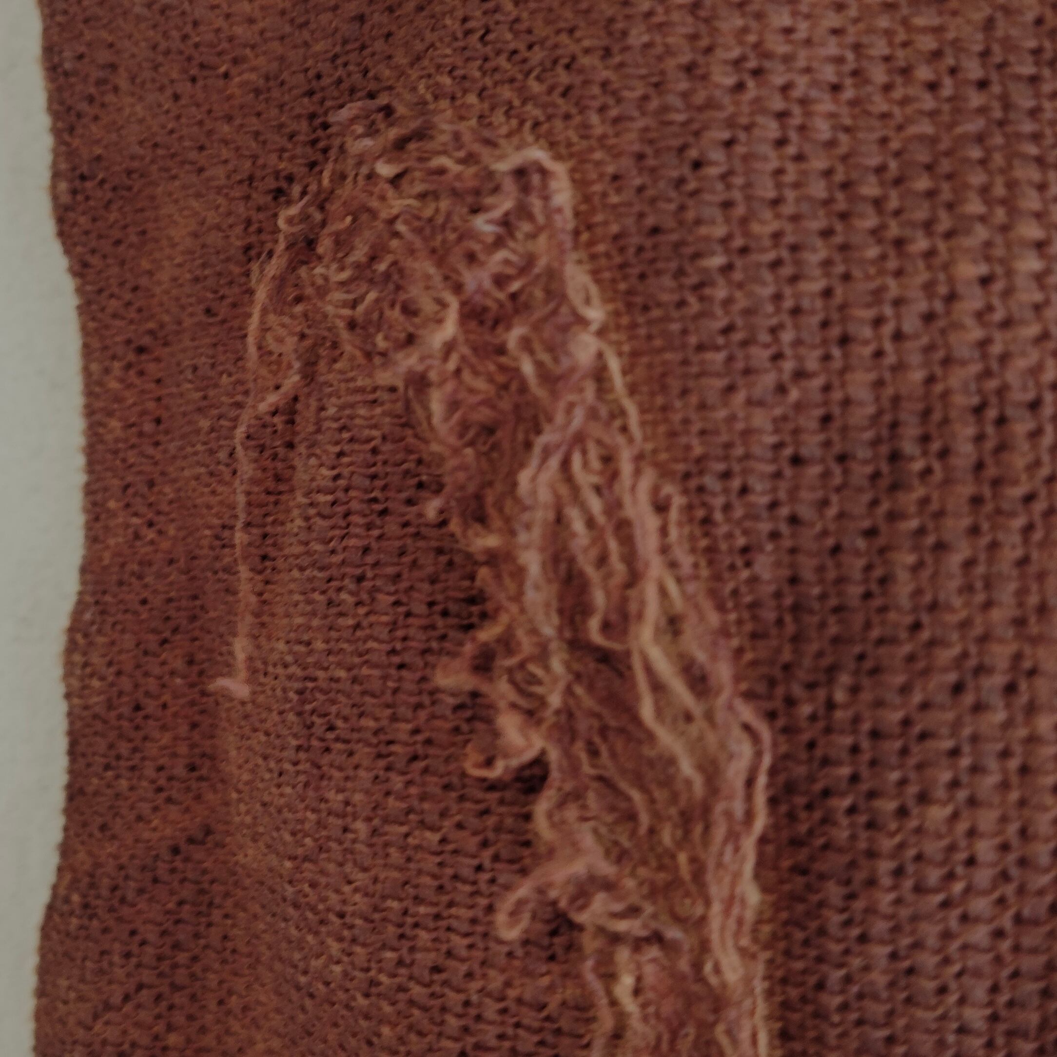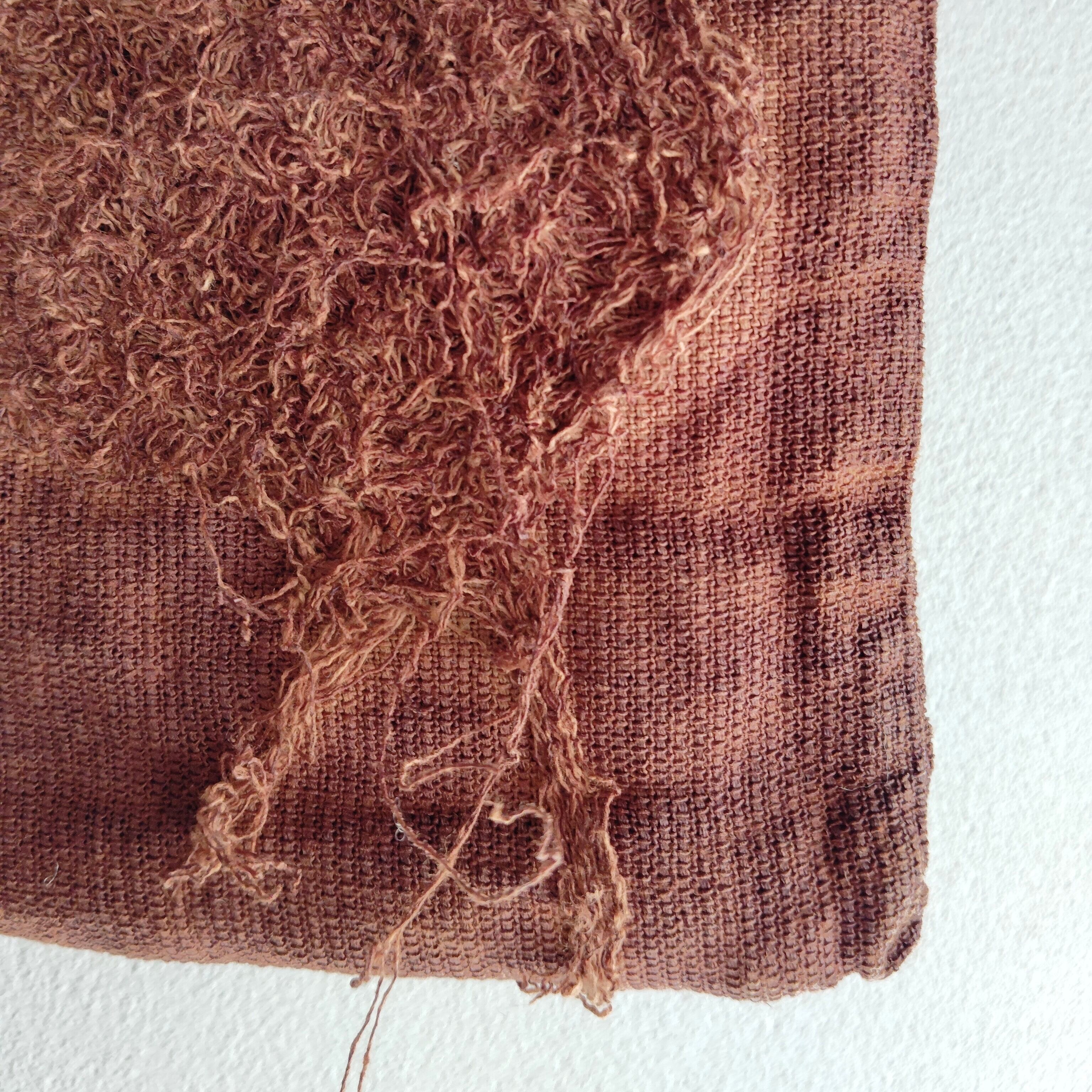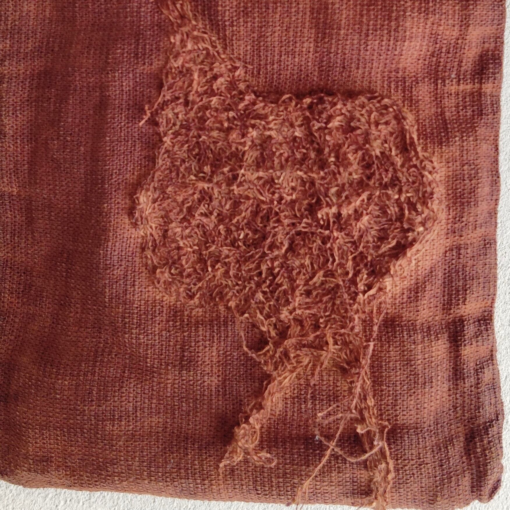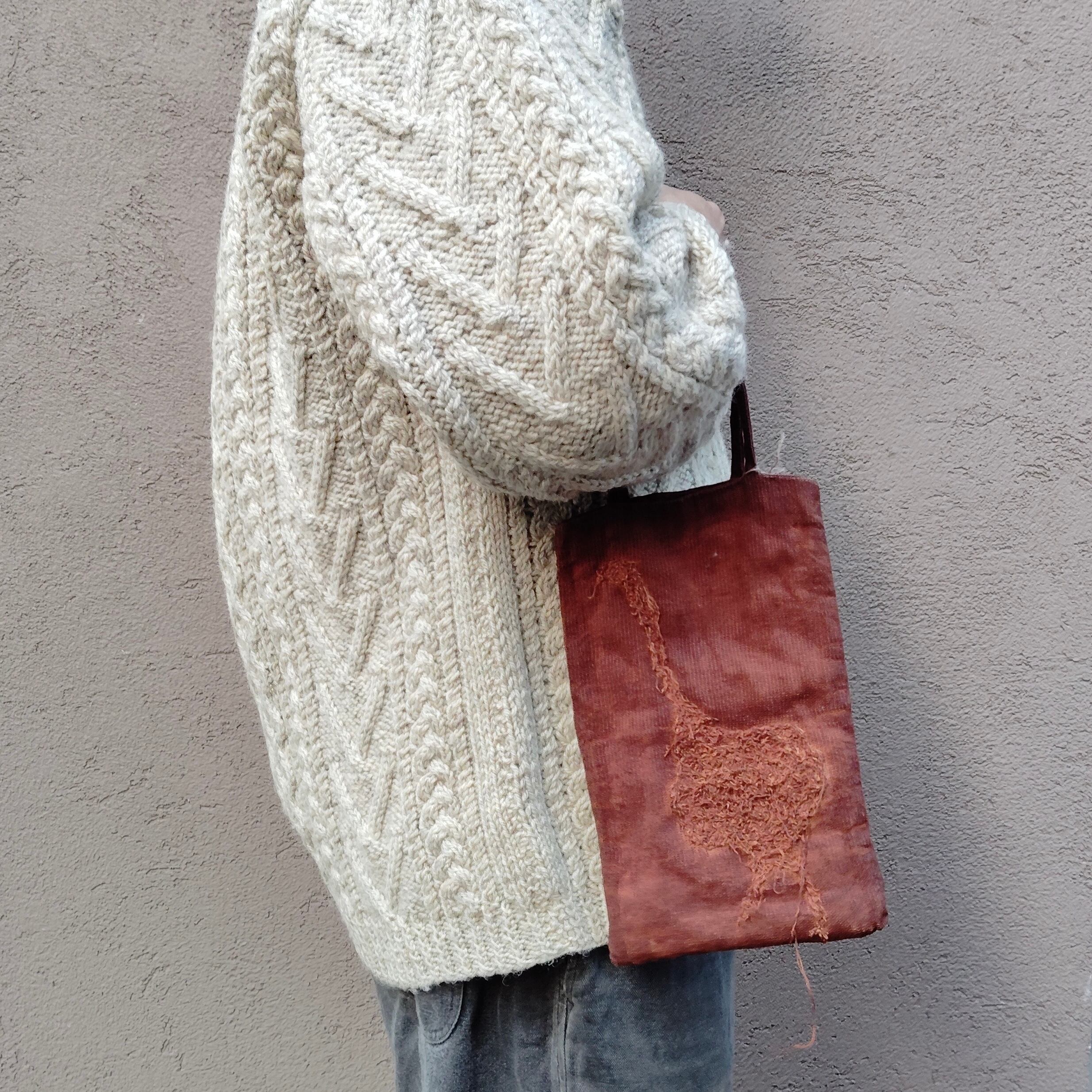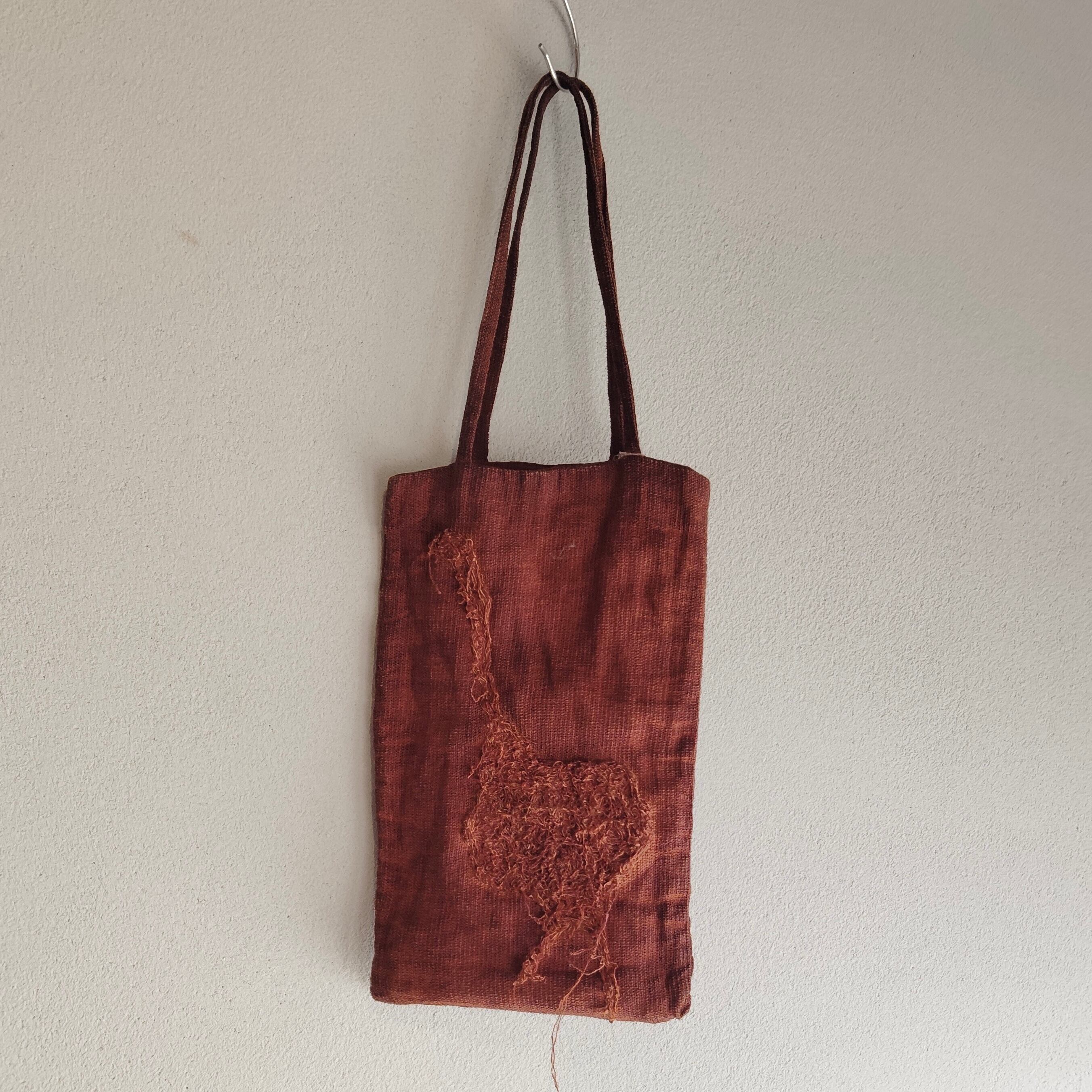 リネン100%の生地にベンガラで赤茶に染めた小ぶりなバッグ。